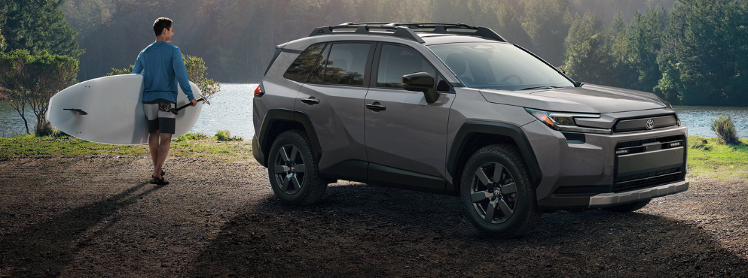 Do you want to take your RAV4 for a serious outdoors adventure? The 2026 RAV4 Woodland trim includes accessories and features perfect for off-road driving; including roof rails, a more rugged front-end design focused on challenging driving conditions, and 18” wheels with all-terrain tires.